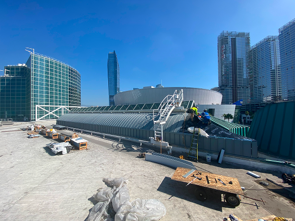 LZI investigated sources of water intrusion through the existing signature green, standing seam metal roofing in flat and curved configurations along the Concourse, Compass and South Hall. Leakage through deteriorated asphalt felt roofing underlayment, transitions and at internal gutters was significantly disrupting building operations and deteriorating interior finishes. LZI closely collaborated with the roofing trade partner, to conduct forensic water testing, and temporarily deconstruct select areas of the roof panels to understand the as-built assembly and accurately inform the replacement design. LZI developed repair design drawings and specifications for the replacement of the roof, which required matching the existing finishes and color. LZI’s design enhanced the waterproofing characteristics by specifying more contemporary and high-performance roofing products including high compressive strength gypsum cover board and high-temperature resistant self-adhered underlayment that replaced the failed existing asphalt-saturated roofing felt. LZI’s design also emphasized sustainability and scope efficiency by reusing the existing rigid board installation. LZI is supporting the project during construction by conducting submittal reviews, periodic site visit observations, and addressing field conditions. The roof construction is in currently ongoing.